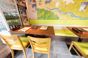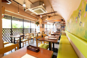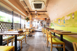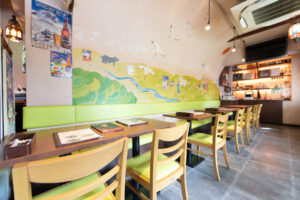 1.店舗入り口のドアを開けると楽しい壁画が目に飛び込みます。ヒマラヤの山々に住む動物達が温かくお出迎え、ガネーシャ神も楽しく踊っています。この壁画は西荻在住のイラストレーター ハラダエリコ(http://haradaeriko.com/)さんによるもので、子ども達にも大人気です。